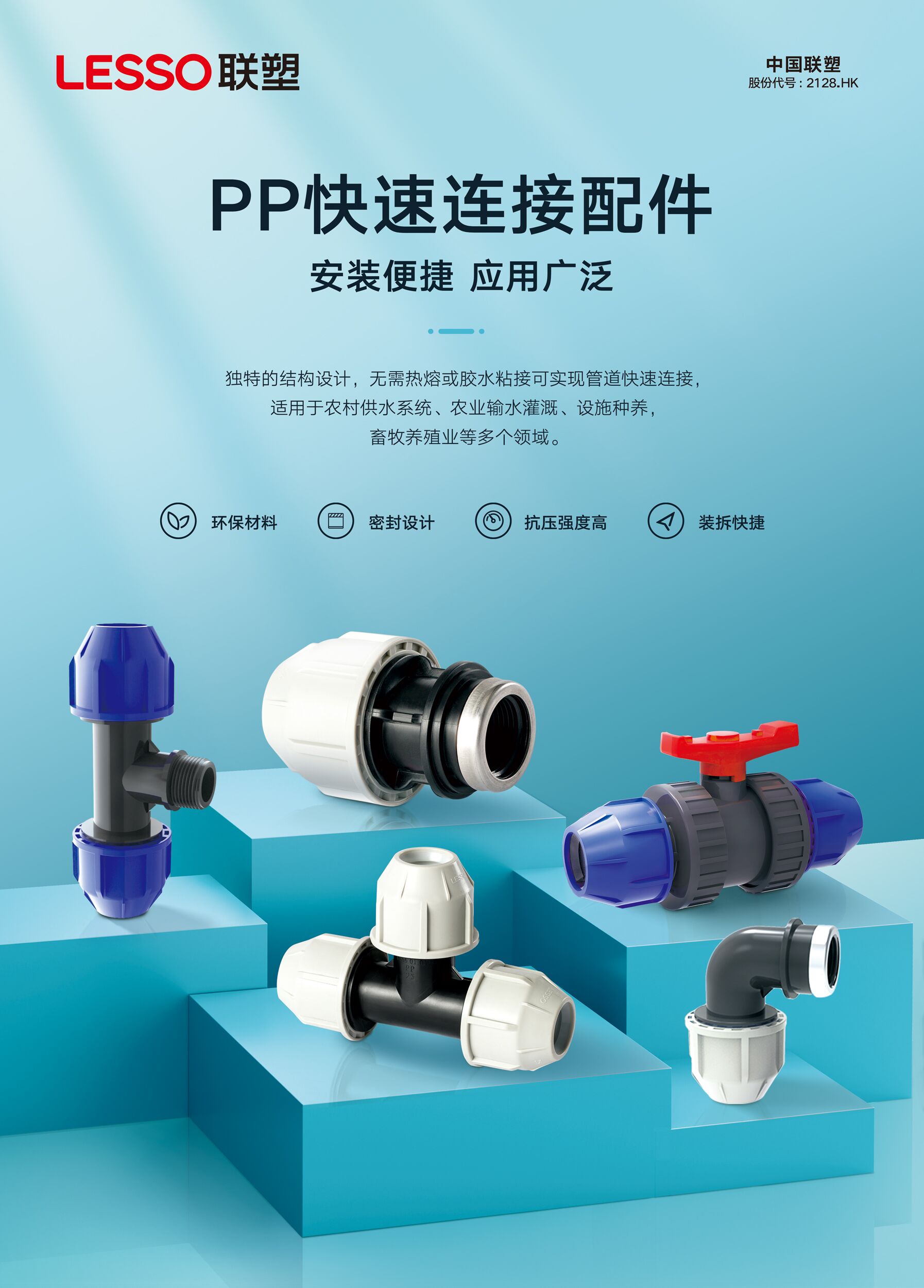 PP快速連接配件主要適用于PP、PE等管道的快速連接,易安裝,易維護,采用徑向外夾緊結(jié)構(gòu),無需專業(yè)熱熔或膠水粘接,省了時省力,可拆裝的結(jié)構(gòu)方便管路的維護,還提高了連接的可靠性和安全性。采用全新環(huán)保PP材料,具有耐高溫、耐腐蝕、耐高壓等優(yōu)點,能夠在各種惡劣的環(huán)境下保持穩(wěn)定的性能。廣泛應(yīng)用于高標準農(nóng)田、設(shè)施溫室、山林等輸水和灌溉管路的快速連接。